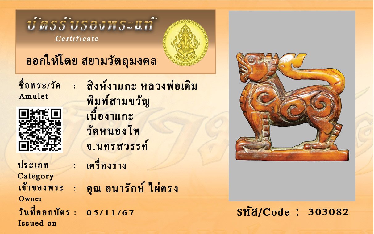รหัสสินค้า : 303082 สิงห์งาแกะ หลวงพ่อเดิม พิมพ์สามขวัญ เนื้องาแกะ วัดหนองโพ จ.นครสวรรค์