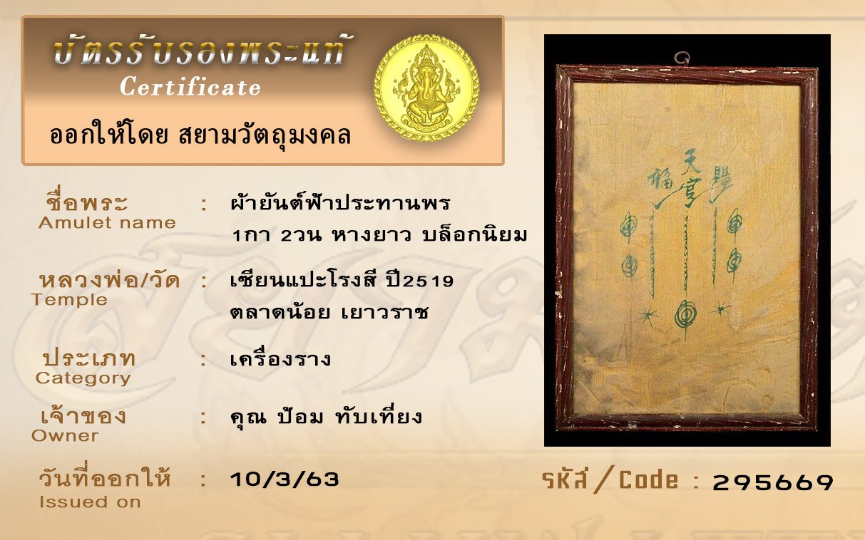 รหัสสินค้า : (295669) ผ้ายันต์ฟ้าประทานพร 1กา 2วน หางยาว บล็อกนิยม เซียนแปะโรงสี ปี2519