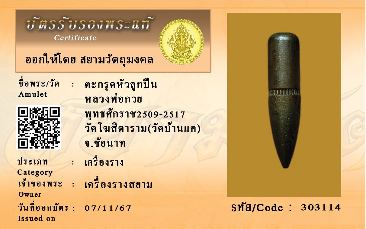 รหัสสินค้า : 303114 ตะกรุดหัวลูกปืน หลวงพ่อกวย พุทธศักราช2509-2517 วัดโฆสิตาราม(วัดบ้านแค) จ.ชัยนาท