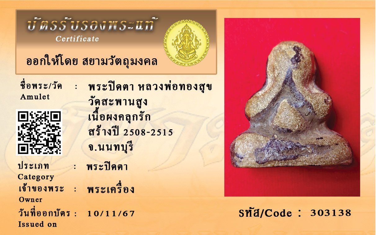 รหัสสินค้า : 303138 พระปิดตา หลวงพ่อทองสุข วัดสะพานสูง เนื้อผงคลุกรัก สร้างปี 2508-2515 จ.นนทบุรี