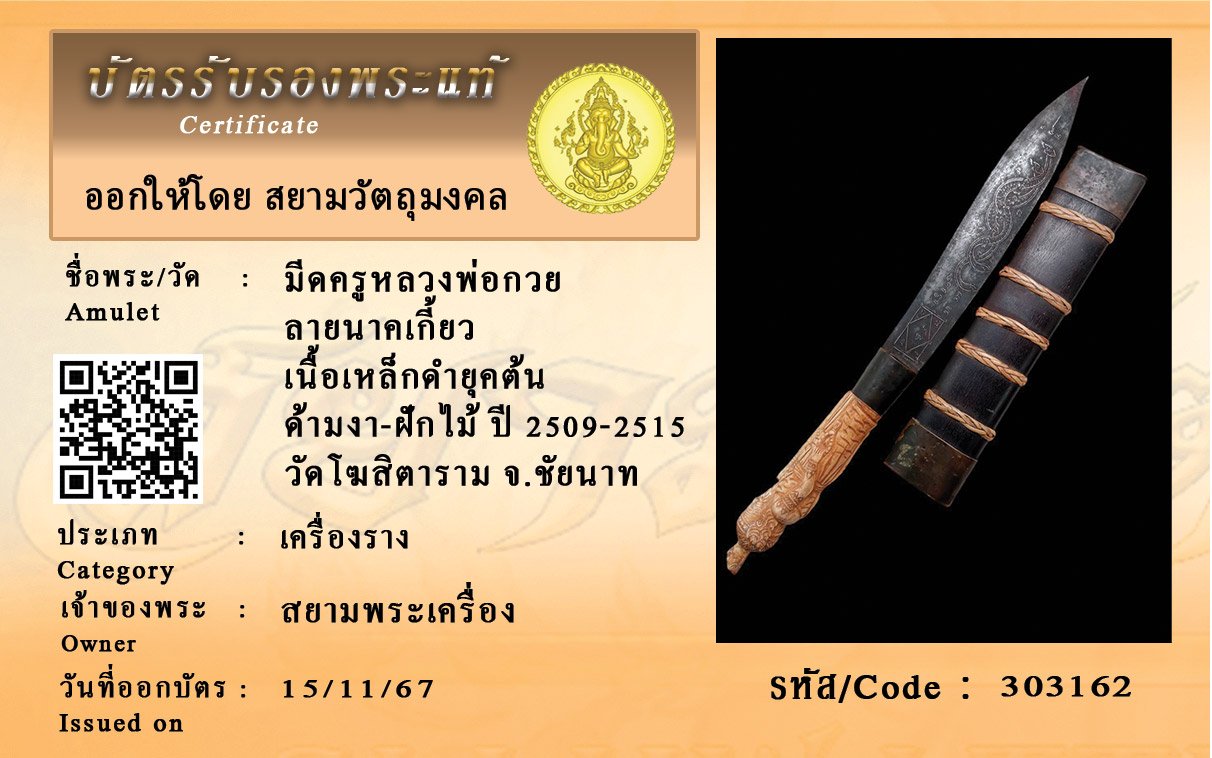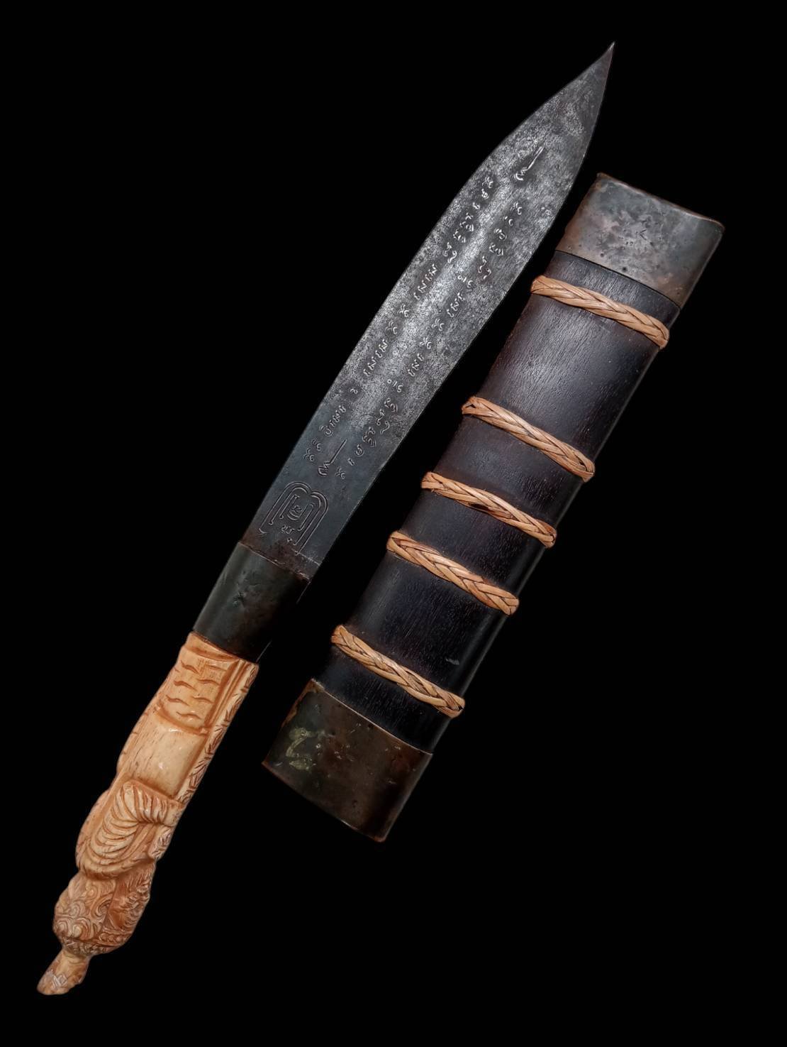 รหัสสินค้า : 303162 มีดครูหลวงพ่อกวย ลายนาคเกี้ยว เนื้อเหล็กดำยุคต้น ด้ามงา-ฝักไม้ ปี 2509-2515 วัดโฆสิตาราม จ.ชัยนาท