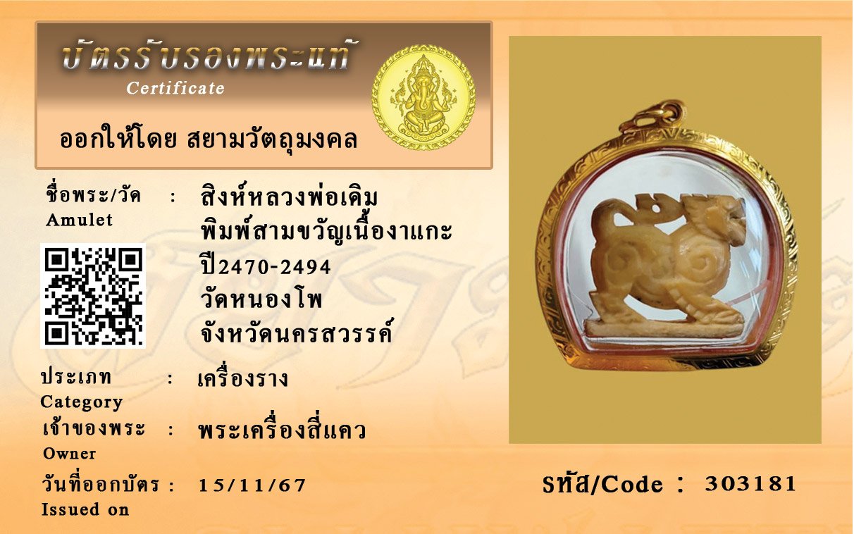 รหัสสินค้า : 303181 สิงห์หลวงพ่อเดิม พิมพ์สามขวัญเนื้องาแกะ ปี2470-2494 วัดหนองโพ จังหวัดนครสวรรค์