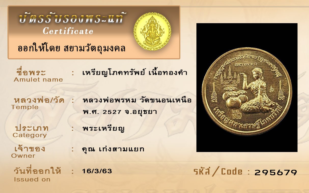 รหัสสินค้า : (295679) เหรียญโภคทรัพย์เนื้อทองคำ หลวงพ่อพรหม วัดขนอนเหนือ จ.อยุธยา พ. ศ. 2527
