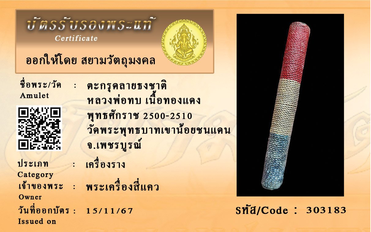 รหัสสินค้า : 303183 ตะกรุดลายธงชาติ หลวงพ่อทบ เนื้อทองแดง พุทธศักราช 2500-2510 วัดพระพุทธบาทเขาน้อยชนแดน จ.เพชรบูรณ์