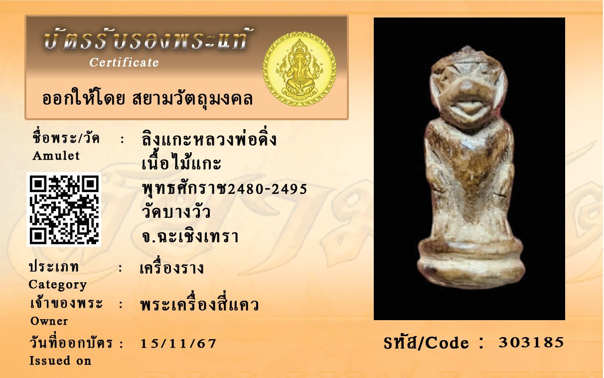 รหัสสินค้า : 303185 ลิงแกะหลวงพ่อดิ่ง เนื้อไม้แกะ พุทธศักราช2480-2495 วัดบางวัว จ.ฉะเชิงเทรา