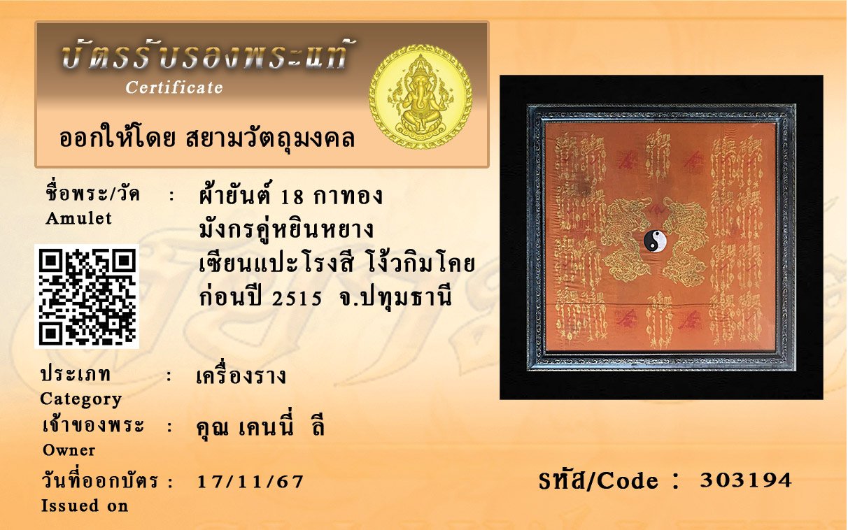 รหัสสินค้า : 303194 ผ้ายันต์ 18 กาทอง มังกรคู่หยินหยาง เซียนแปะโรงสี โง้วกิมโคย ก่อนปี 2515 จ.ปทุมธานี