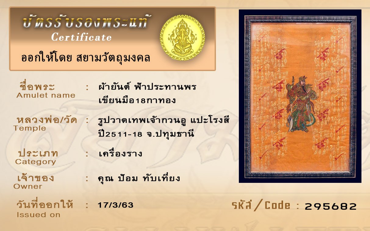 รหัสสินค้า : (295682) ผ้ายันต์ฟ้าประทานพร เขียนมือ 18กาทอง รูปวาดเทพเจ้ากวนอู แปะโรงสี ปี2511-18 จ.ปทุมธาน
