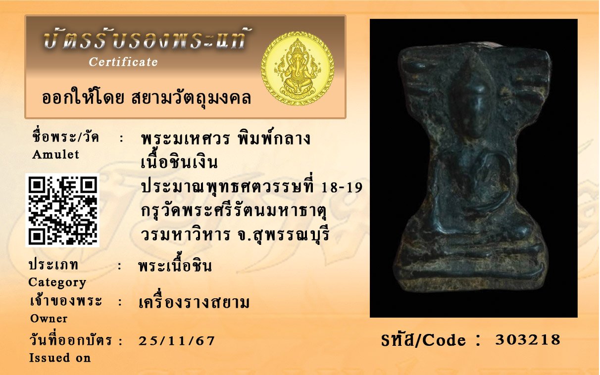 รหัสสินค้า : 303218 พระมเหศวร พิมพ์กลาง เนื้อชินเงิน ประมาณพุทธศตวรรษที่ 18-19 กรุวัดพระศรีรัตนมหาธาตุ วรมหาวิหาร จ.สุพรรณบุรี