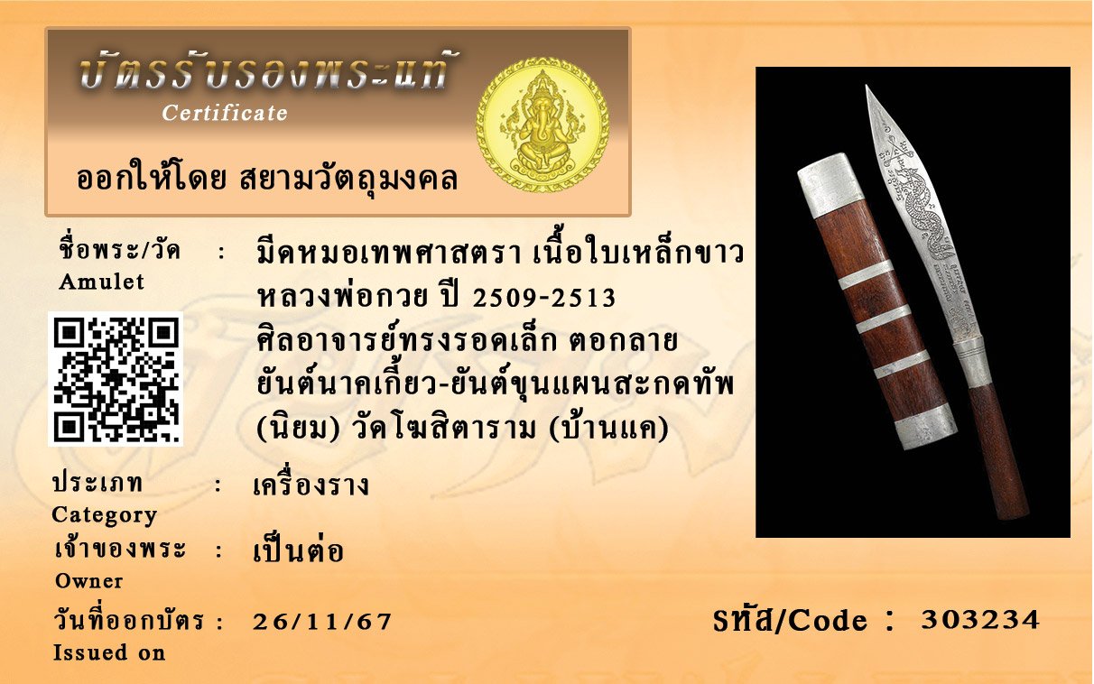 รหัสสินค้า : 303234 มีดหมอเทพศาสตรา เนื้อใบเหล็กขาว หลวงพ่อกวย ปี 2509-2513 ศิลอาจารย์ทรงรอดเล็ก ตอกลาย ยันต์นาคเกี้ยว-ยันต์ขุนแผนสะกดทัพ (นิยม) วัดโฆสิตาราม (บ้านแค)