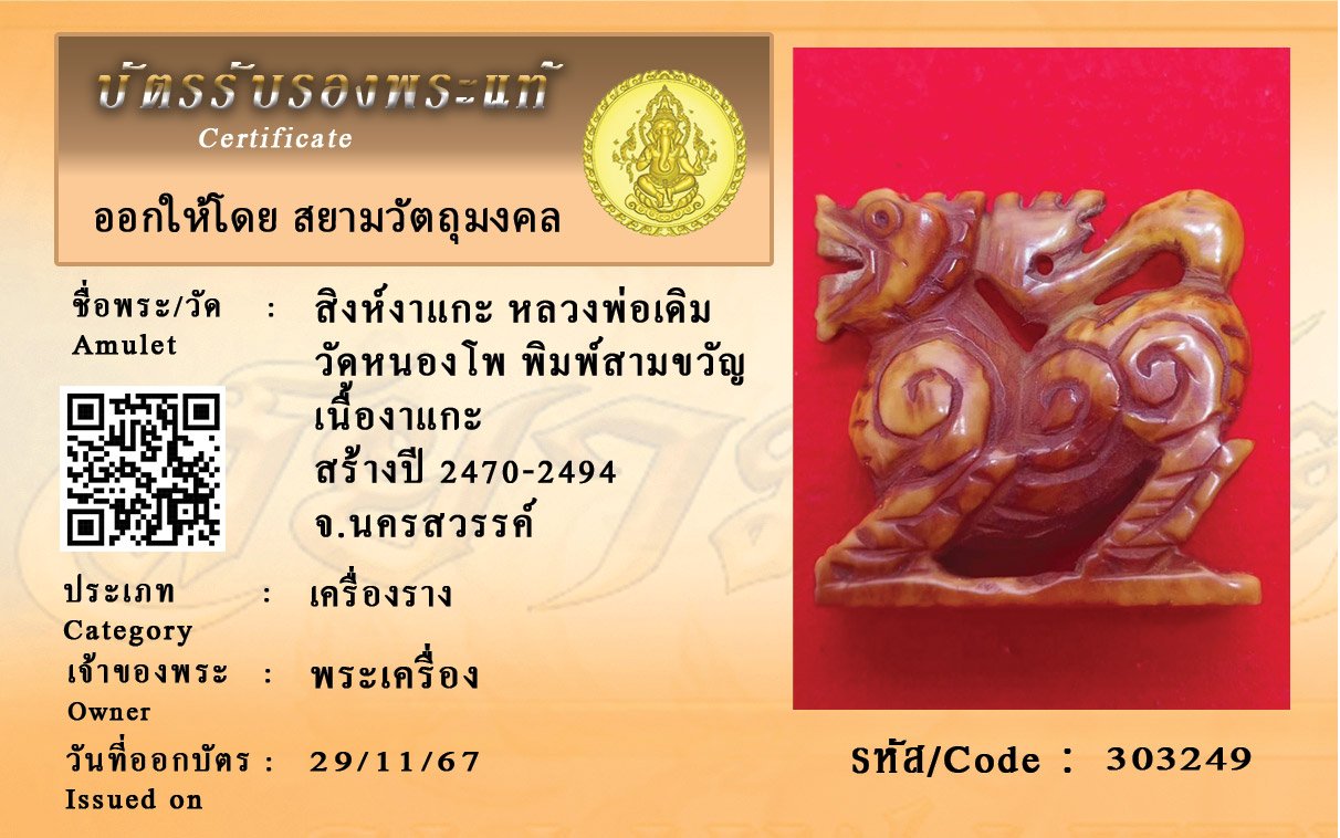 รหัสสินค้า : 303249 สิงห์งาแกะ หลวงพ่อเดิม วัดหนองโพ พิมพ์สามขวัญ เนื้องาแกะ สร้างปี 2470-2494 จ.นครสวรรค์