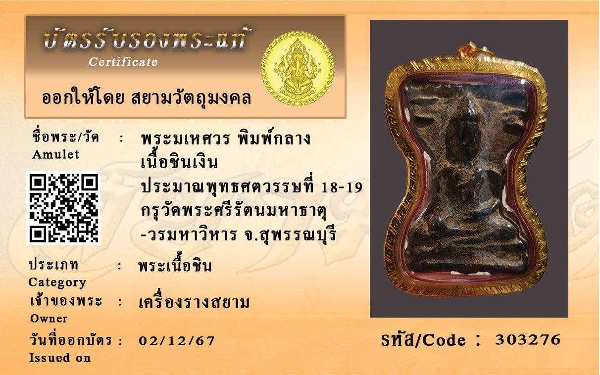 รหัสสินค้า : 303276 พระมเหศวร พิมพ์กลาง เนื้อชินเงิน ประมาณพุทธศตวรรษที่ 18-19 กรุวัดพระศรีรัตนมหาธาตุ -วรมหาวิหาร จ.สุพรรณบุรี