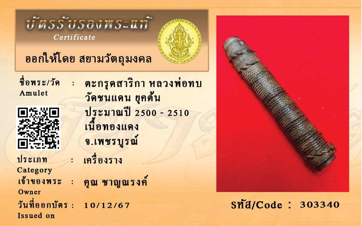 รหัสสินค้า : 303340 ตะกรุดสาริกา หลวงพ่อทบ วัดชนแดน ยุคต้น ประมาณปี 2500 - 2510 เนื้อทองแดง จ.เพชรบูรณ์