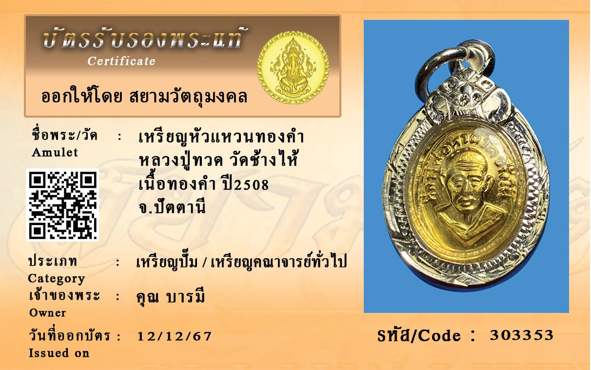 รหัสสินค้า : 303353 เหรียญหัวแหวนทองคำ หลวงปู่ทวด วัดช้างไห้ เนื้อทองคำ ปี2508 จ.ปัตตานี