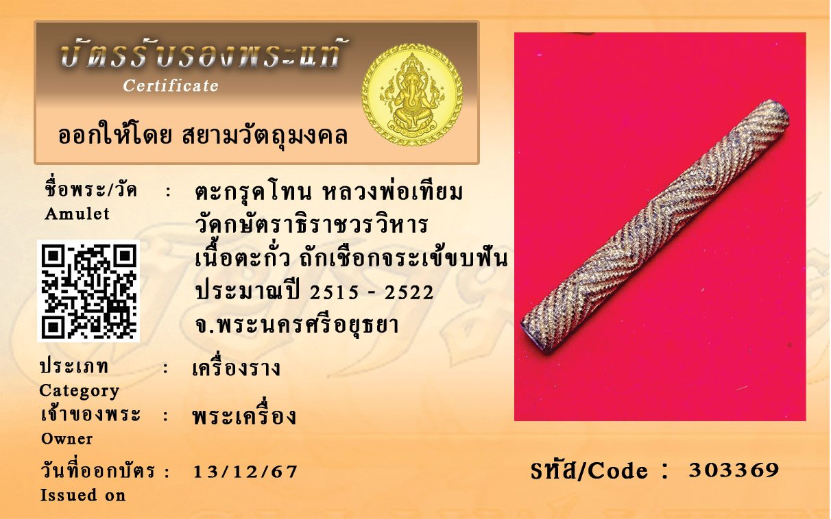 รหัสสินค้า : 303369 ตะกรุดโทน หลวงพ่อเทียม วัดกษัตราธิราชวรวิหาร เนื้อตะกั่ว ถักเชือกจระเข้ขบฟัน ประมาณปี 2515 - 2522 จ.พระนครศรีอยุธยา