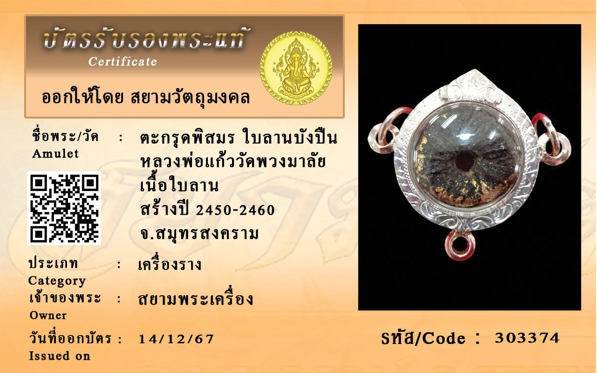 รหัสสินค้า : 303374 ตะกรุดพิสมร ใบลานบังปืน หลวงพ่อแก้ววัดพวงมาลัย เนื้อใบลาน สร้างปี 2450-2460 จ.สมุทรสงคราม