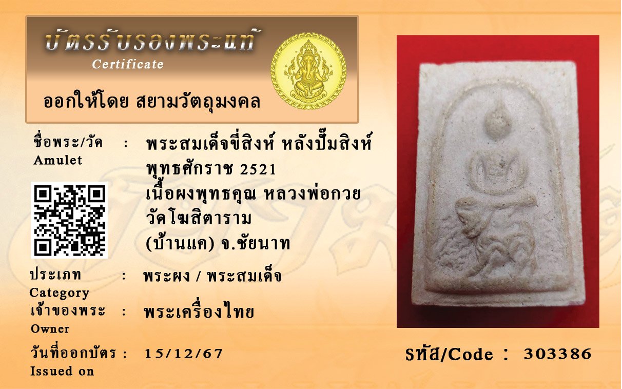 รหัสสินค้า : 303386 พระสมเด็จขี่สิงห์ หลังปั๊มสิงห์ พุทธศักราช 2521 เนื้อผงพุทธคุณ หลวงพ่อกวย วัดโฆสิตาราม (บ้านแค) จ.ชัยนาท