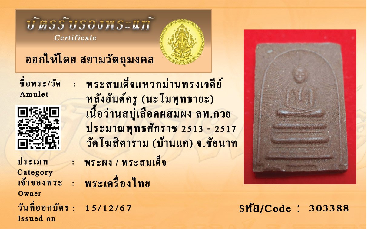 รหัสสินค้า : 303388 พระสมเด็จแหวกม่านทรงเจดีย์ หลังยันต์ครู (นะโมพุทธายะ) เนื้อว่านสบู่เลือดผสมผง หลวงพ่อกวย ประมาณพุทธศักราช 2513 - 2517 วัดโฆสิตาราม (บ้านแค) จ.ชัยนาท