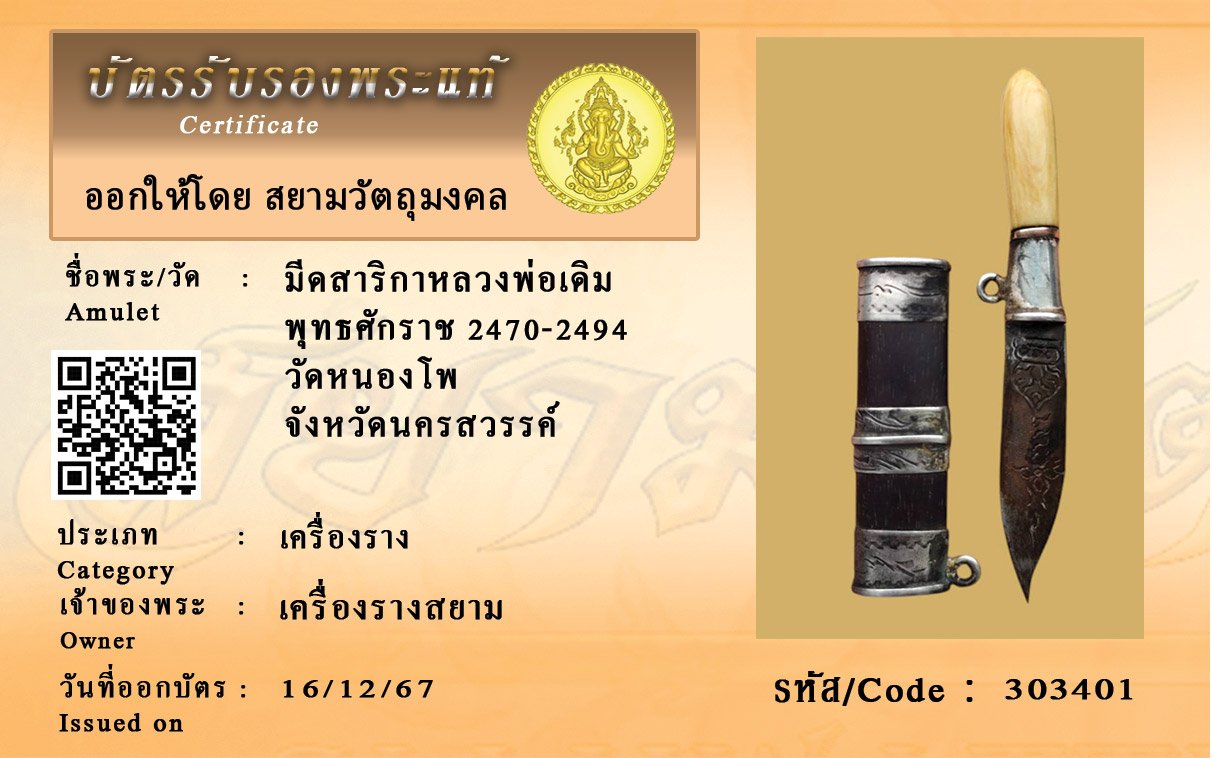 รหัสสินค้า : 303401 มีดสาริกาหลวงพ่อเดิม พุทธศักราช 2470-2494 วัดหนองโพ จังหวัดนครสวรรค์