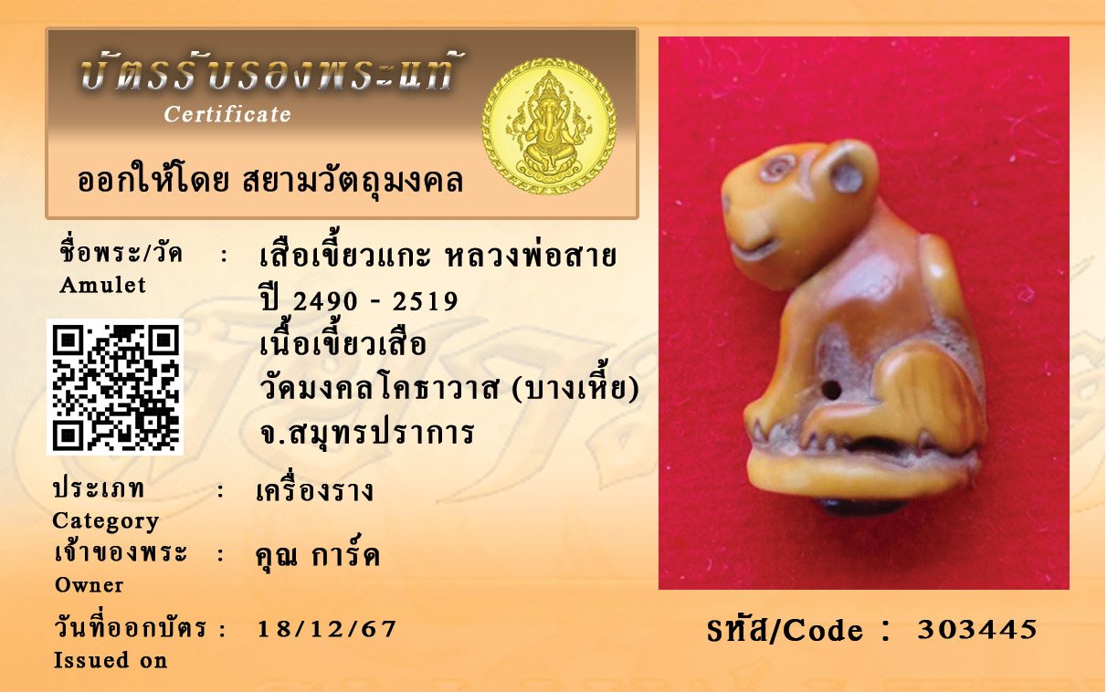 รหัสสินค้า : 303445 เสือเขี้ยวแกะ หลวงพ่อสาย ปี 2490 - 2519 เนื้อเขี้ยวเสือ วัดมงคลโคธาวาส (บางเหี้ย) จ.สมุทรปราการ