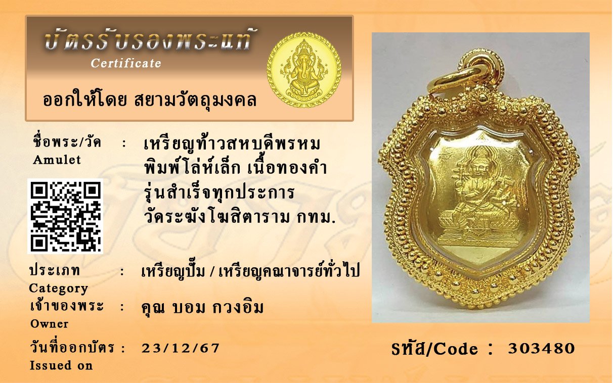 รหัสสินค้า : 303480 เหรียญท้าวสหบดีพรหม พิมพ์โล่ห์เล็ก เนื้อทองคำ รุ่นสำเร็จทุกประการ วัดระฆังโฆสิตาราม กทม.
