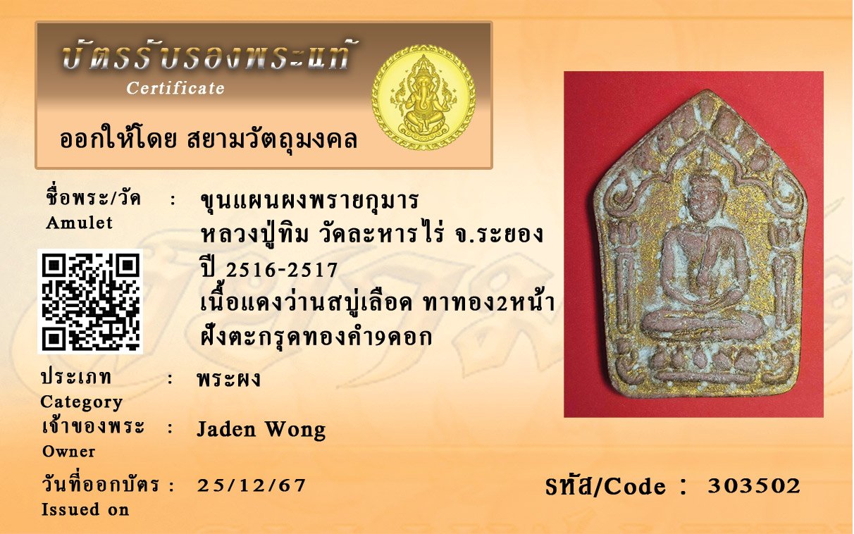 รหัสสินค้า : 303502 ชื่อพระ:ขุนแผนผงพรายกุมาร หลวงปู่ทิม วัดละหารไร่ จ.ระยอง ปี 2516-2517 เนื้อแดงว่านสบู่เลือด ทาทอง2หน้า ฝังตะกรุดทองคำ9ดอก