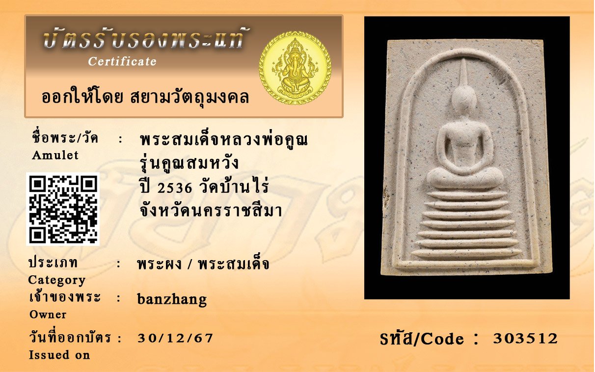 รหัสสินค้า : 303512 พระสมเด็จหลวงพ่อคูณ รุ่นคูณสมหวัง ปี 2536 วัดบ้านไร่ จังหวัดนครราชสีมา