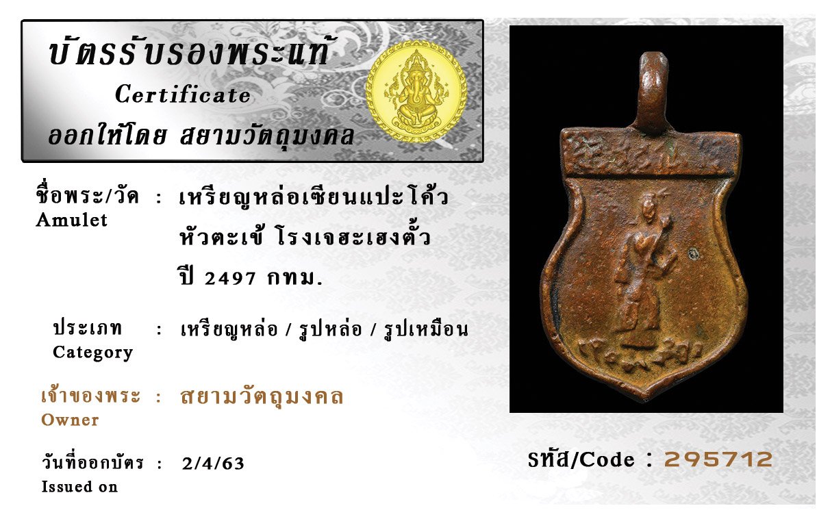รหัสสินค้า : (295712) เหรียญหล่อเซียนแปะโค้วหัวตะเข้ โรงเจฮะเฮงตั้ว ปี 2497 กทม.