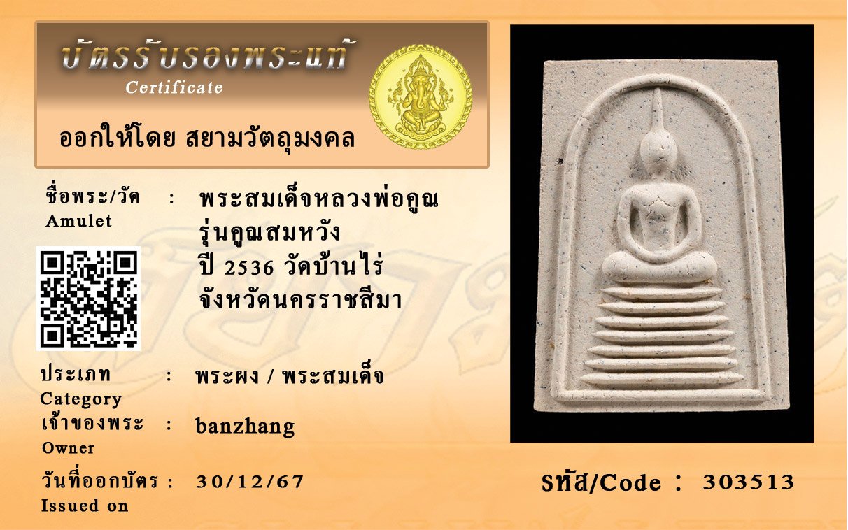 รหัสสินค้า : 303513 พระสมเด็จหลวงพ่อคูณ รุ่นคูณสมหวัง ปี 2536 วัดบ้านไร่ จังหวัดนครราชสีมา