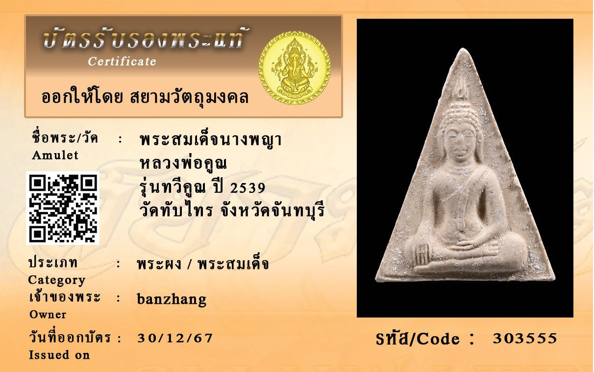 รหัสสินค้า : 303555 พระสมเด็จนางพญา หลวงพ่อคูณ รุ่นทวีคูณ ปี 2539 วัดทับไทร จังหวัดจันทบุรี
