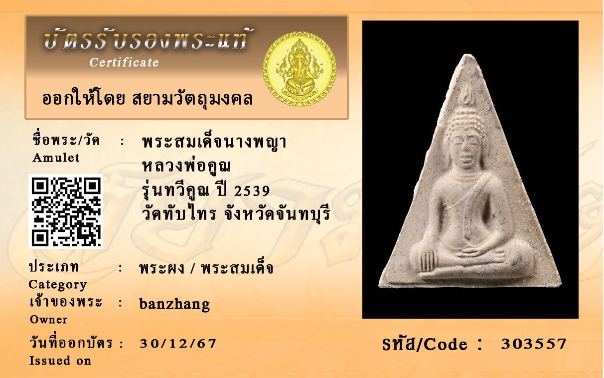 รหัสสินค้า : 303557 พระสมเด็จนางพญา หลวงพ่อคูณ รุ่นทวีคูณ ปี 2539 วัดทับไทร จังหวัดจันทบุรี