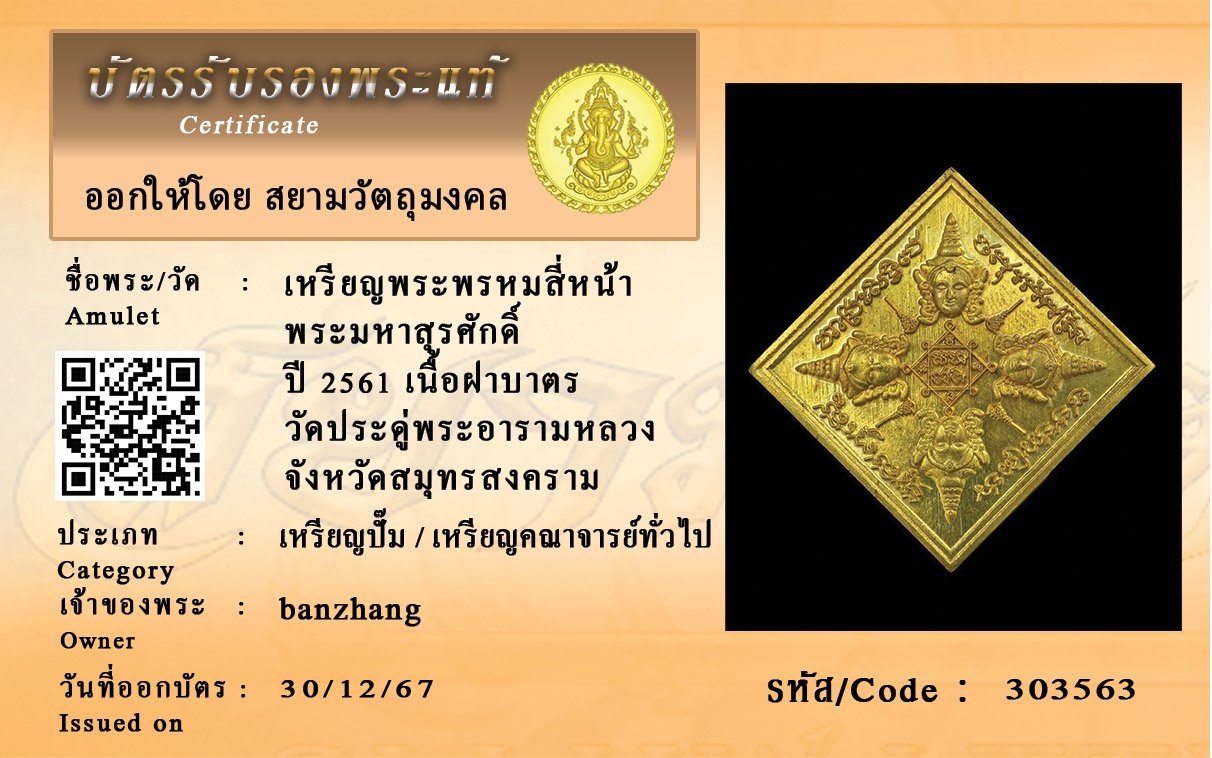 รหัสสินค้า : 303563 เหรียญพระพรหมสี่หน้า พระมหาสุรศักดิ์ ปี 2561 เนื้อฝาบาตร วัดประดู่พระอารามหลวง จังหวัดสมุทรสงคราม