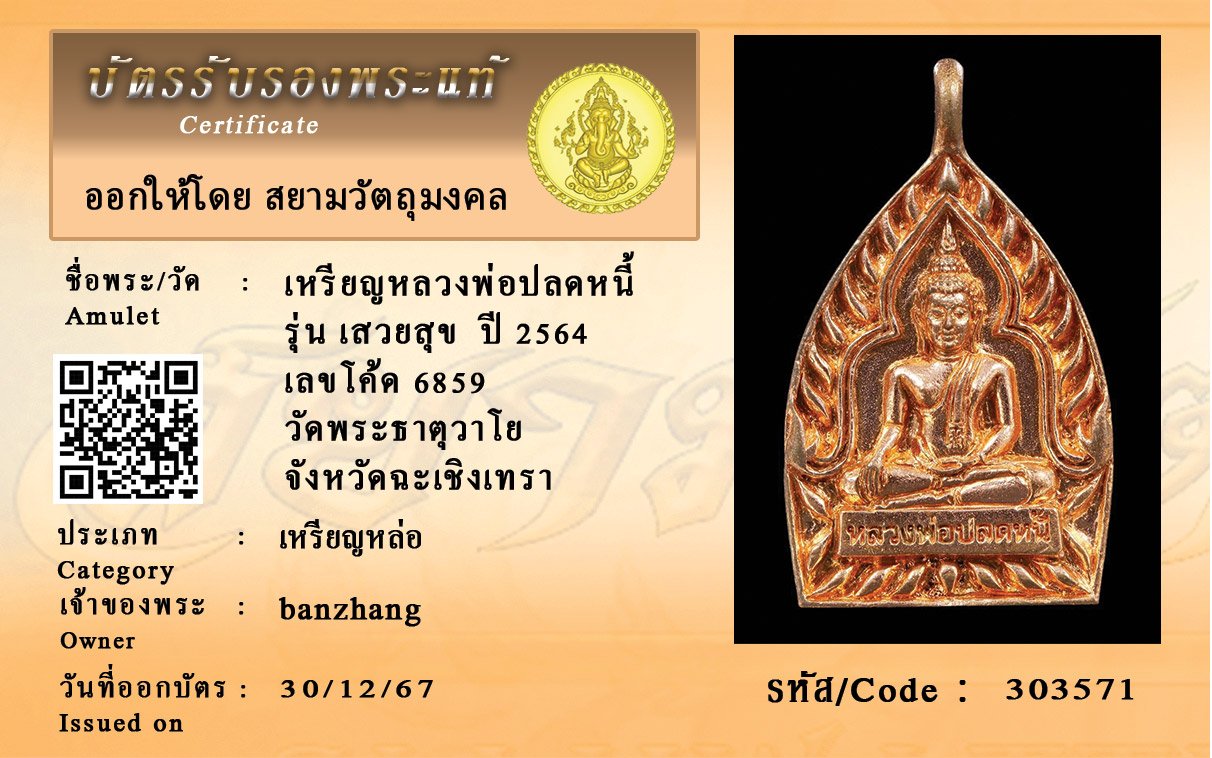รหัสสินค้า : 303571 เหรียญหลวงพ่อปลดหนี้ รุ่น เสวยสุข ปี 2564 เลขโค้ด 6859 วัดพระธาตุวาโย จังหวัดฉะเชิงเทรา