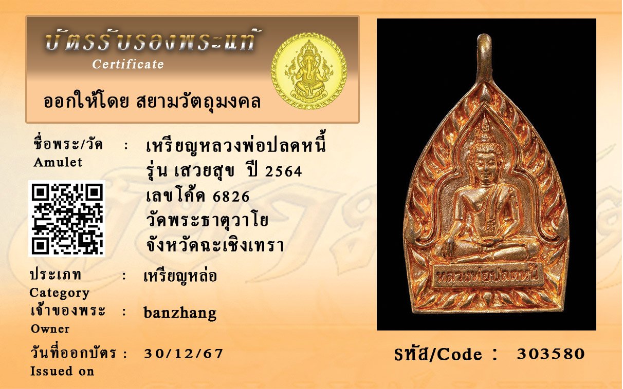 รหัสสินค้า : 303580 เหรียญหลวงพ่อปลดหนี้ รุ่น เสวยสุข ปี 2564 เลขโค้ด 6826 วัดพระธาตุวาโย จังหวัดฉะเชิงเทรา