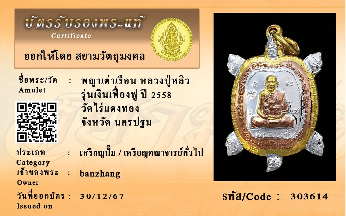 รหัสสินค้า : 303614 พญาเต่าเรือน หลวงปู่หลิว รุ่นเงินเฟื่องฟู ปี 2558 วัดไร่แตงทอง จังหวัด นครปฐม
