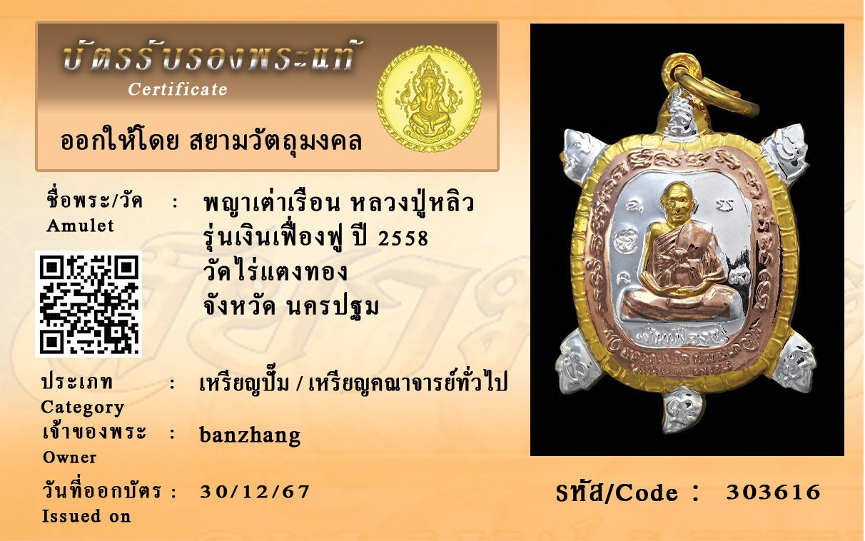 รหัสสินค้า : 303616 พญาเต่าเรือน หลวงปู่หลิว รุ่นเงินเฟื่องฟู ปี 2558 วัดไร่แตงทอง จังหวัด นครปฐม