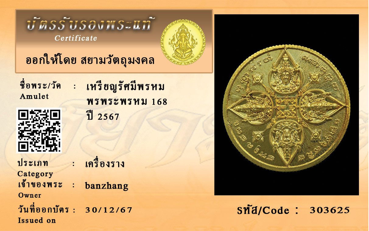 รหัสสินค้า : 303625 เหรียญรัศมีพรหม พรพระพรหม 168 ปี 2567