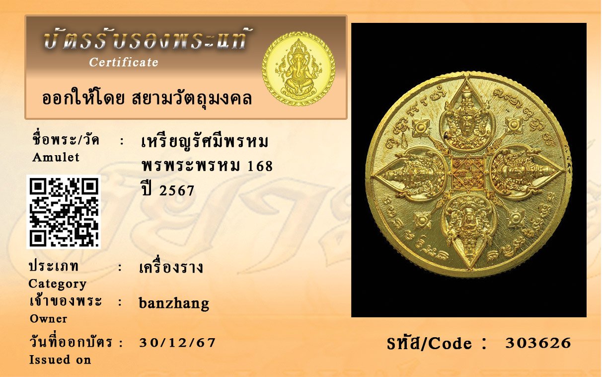 รหัสสินค้า : 303626 เหรียญรัศมีพรหม พรพระพรหม 168 ปี 2567