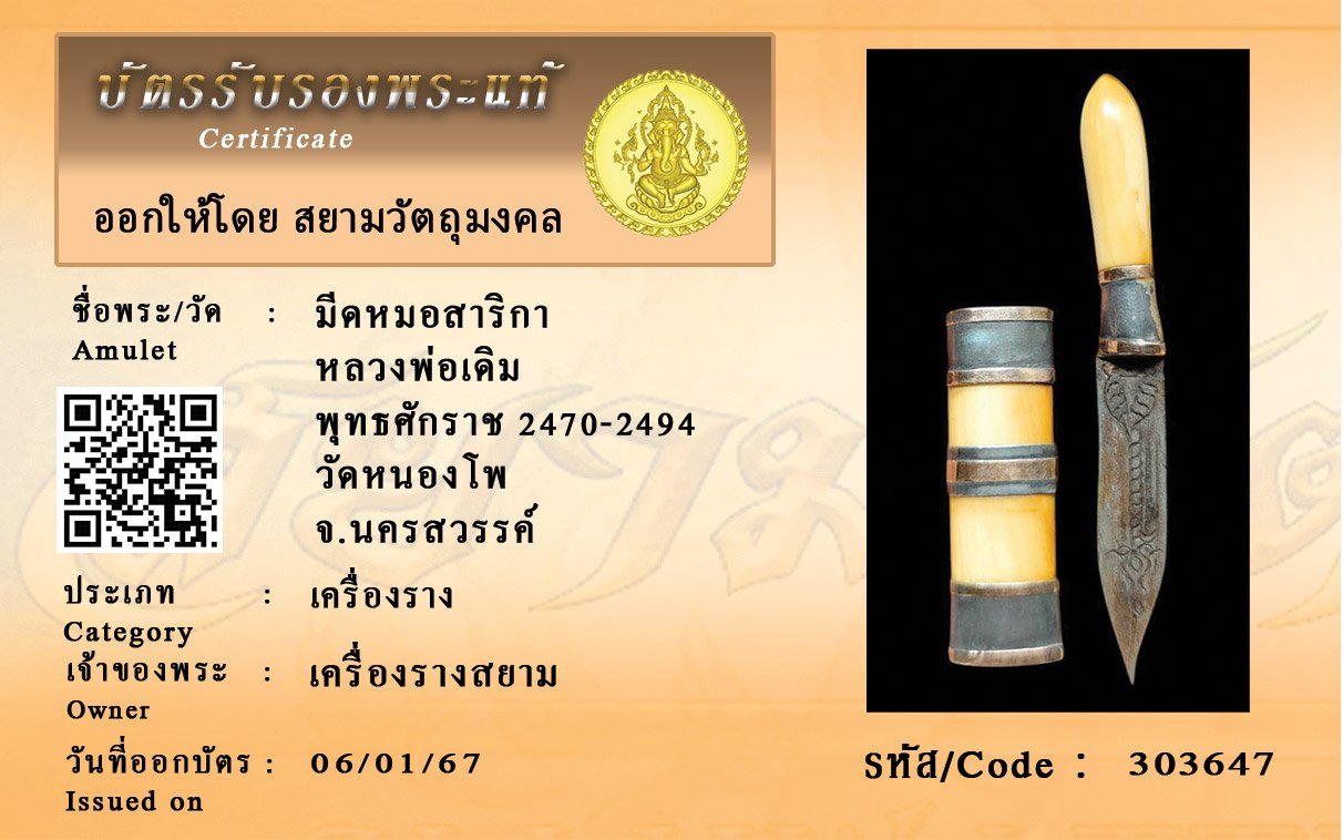 รหัสสินค้า : 303647 มีดหมอสาริกา หลวงพ่อเดิม พุทธศักราช 2470-2494 วัดหนองโพ จ.นครสวรรค์