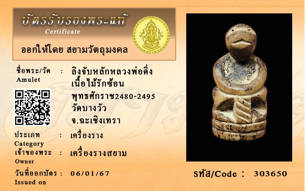 รหัสสินค้า : 303650 ลิงจับหลักหลวงพ่อดิ่ง เนื้อไม้รักซ้อน พุทธศักราช2480-2495 วัดบางวัว จ.ฉะเชิงเทรา