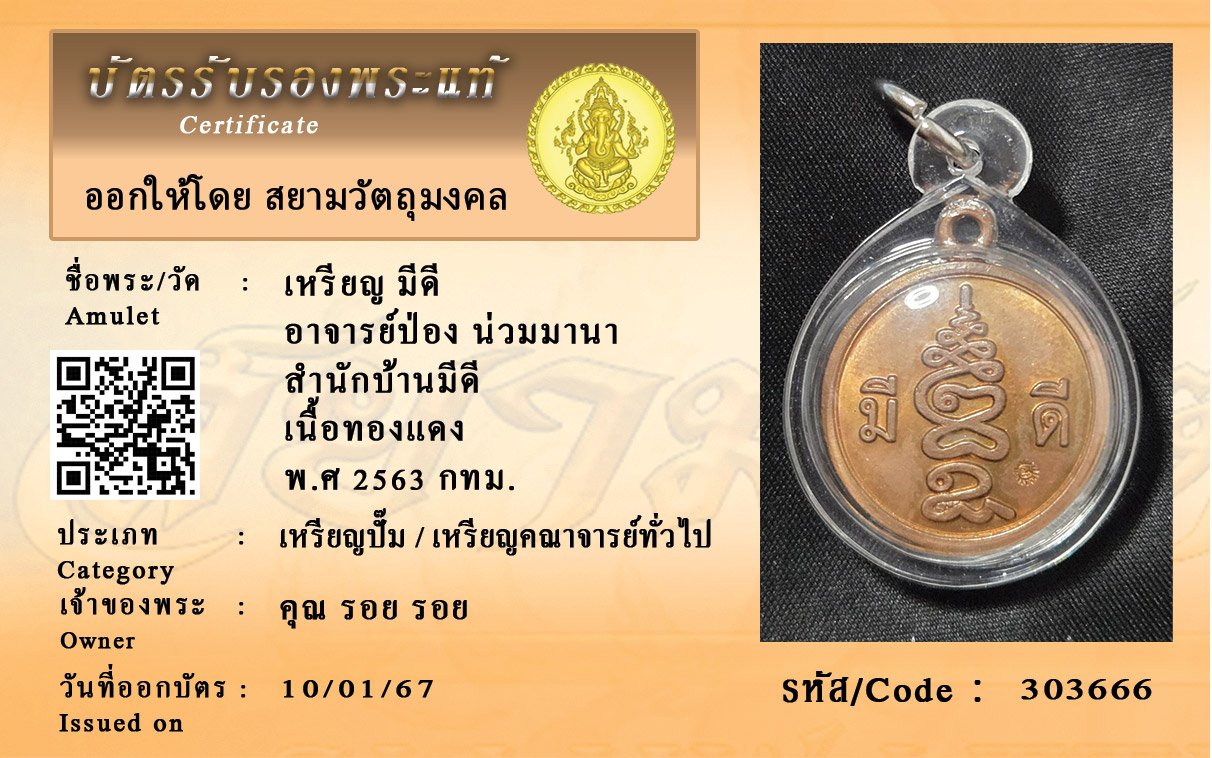 รหัสสินค้า : 303666 เหรียญ มีดี อาจารย์ป่อง น่วมมานา สำนักบ้านมีดี เนื้อทองแดง พ.ศ 2563 กทม.