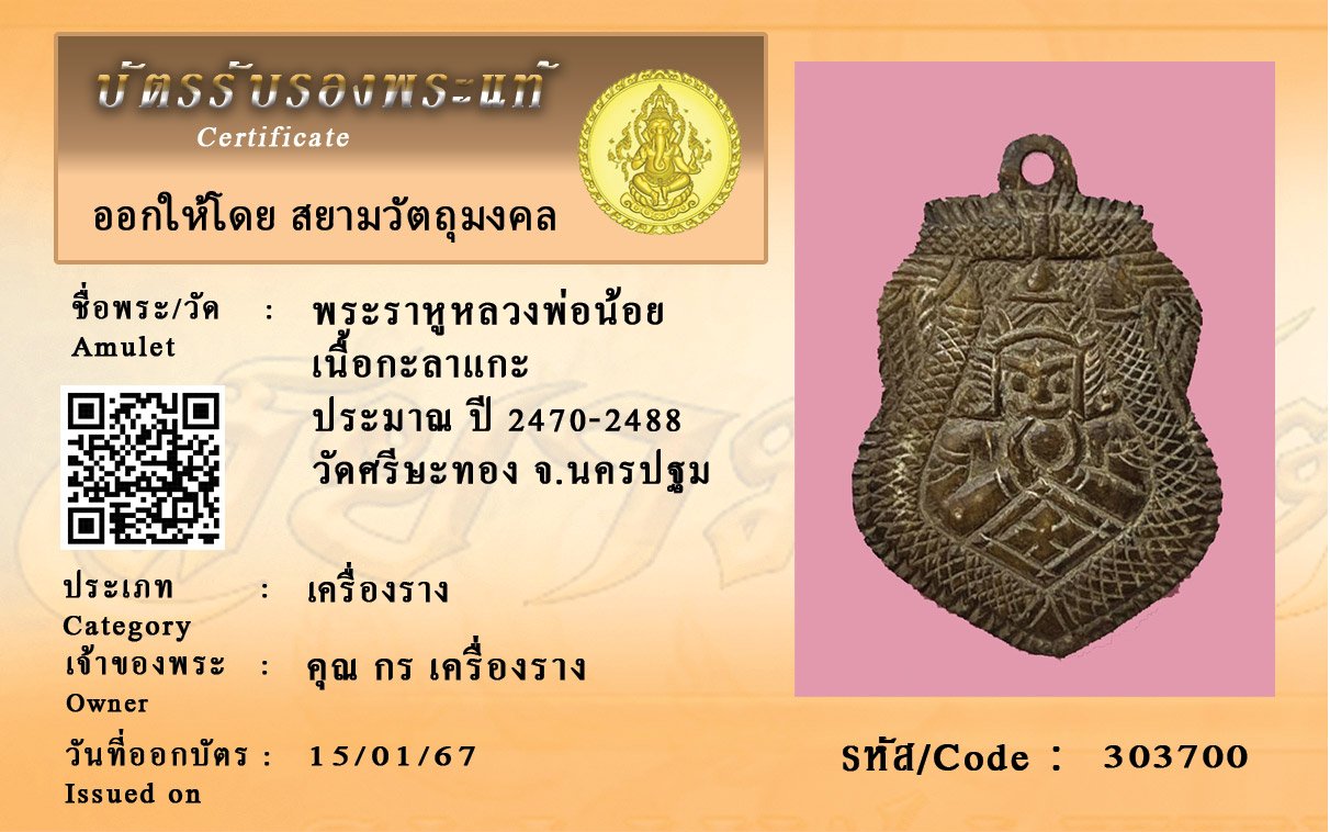รหัสสินค้า : 303700 พระราหูหลวงพ่อน้อย เนื้อกะลาแกะ ประมาณ ปี 2470-2488 วัดศรีษะทอง จ.นครปฐม