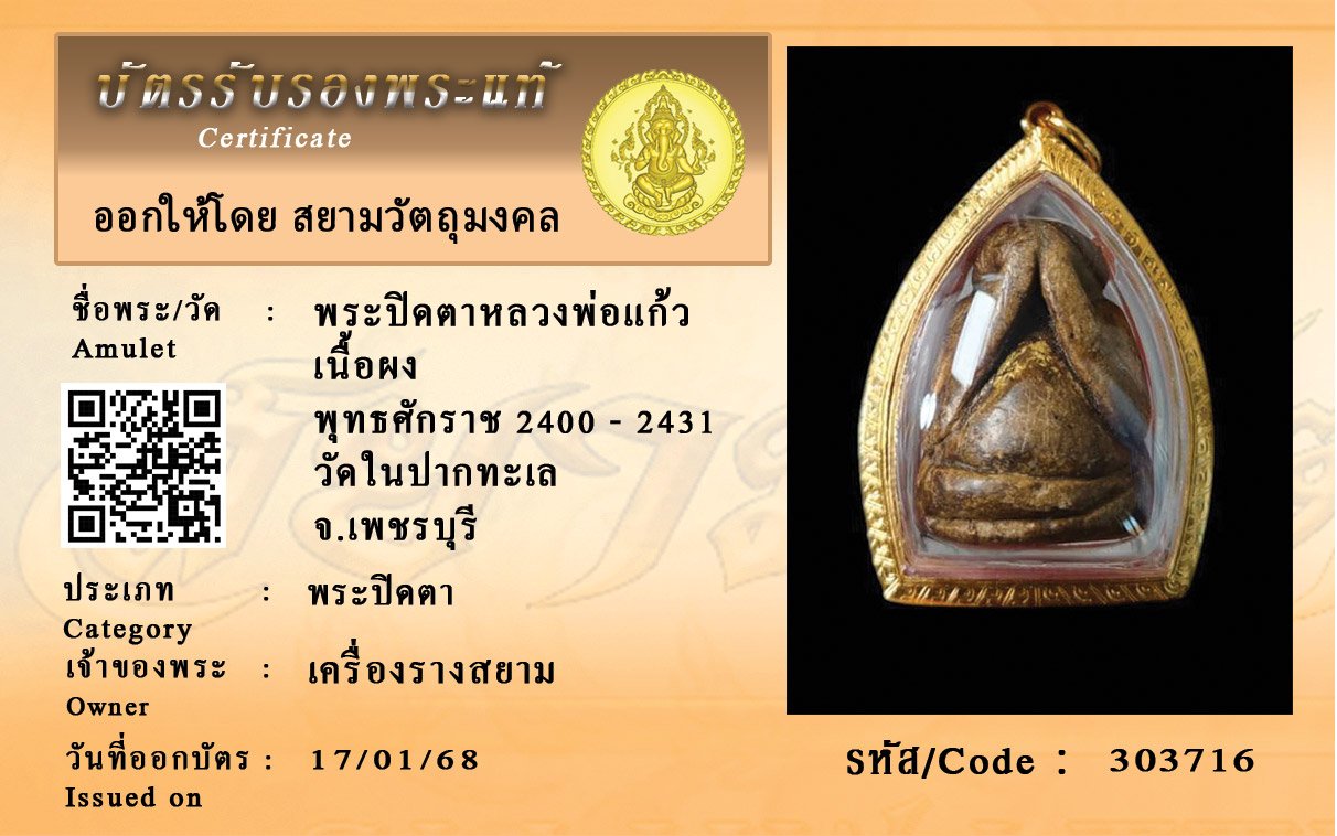 รหัสสินค้า : 303716 พระปิดตาหลวงพ่อแก้ว เนื้อผง พุทธศักราช 2400 - 2431 วัดในปากทะเล จ.เพชรบุรี