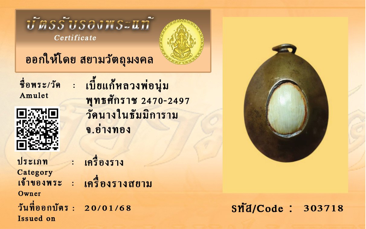 รหัสสินค้า : 303718 เบี้ยแก้หลวงพ่อนุ่ม พุทธศักราช 2470-2497 วัดนางในธัมมิการาม จ.อ่างทอง