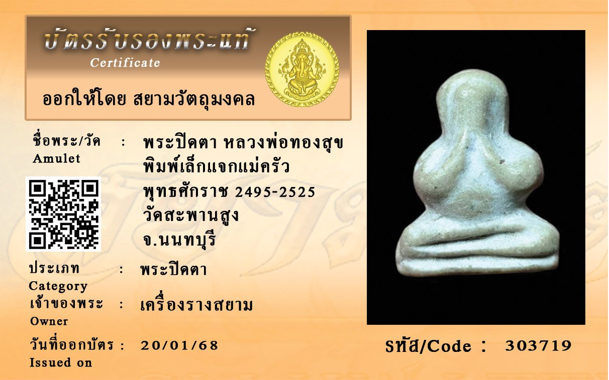 รหัสสินค้า : 303719 พระปิดตา หลวงพ่อทองสุข พิมพ์เล็กแจกแม่ครัว พุทธศักราช 2495-2525 วัดสะพานสูง จ.นนทบุรี