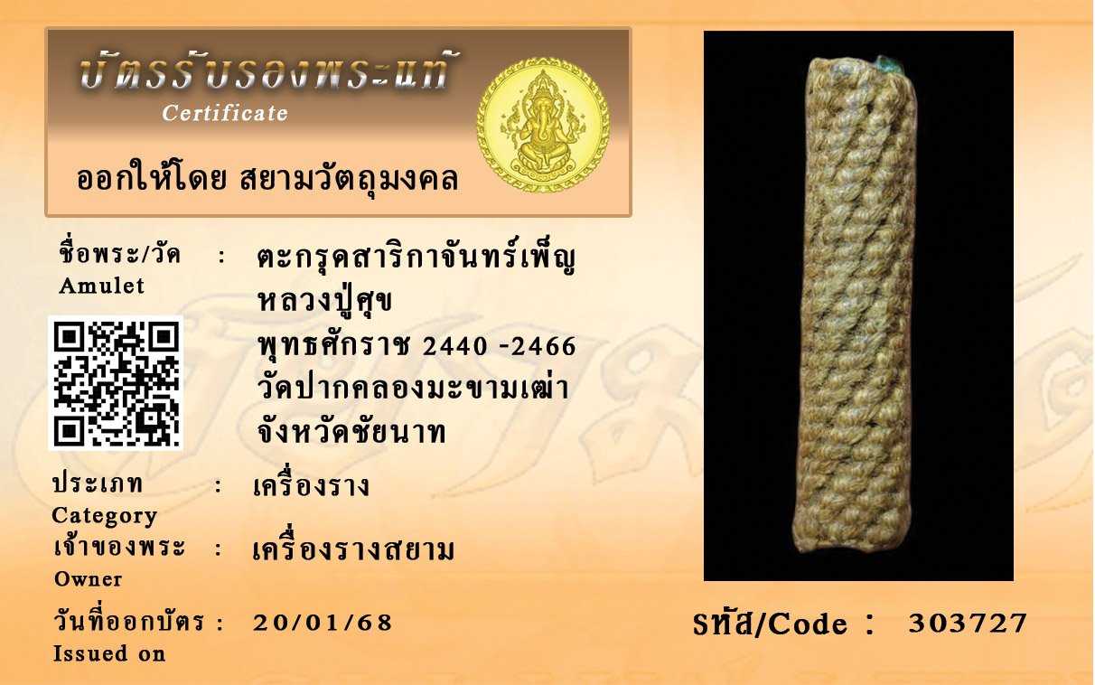 รหัสสินค้า : 303727 ตะกรุดสาริกาจันทร์เพ็ญ หลวงปู่ศุข พุทธศักราช 2440 -2466 วัดปากคลองมะขามเฒ่า จังหวัดชัยนาท