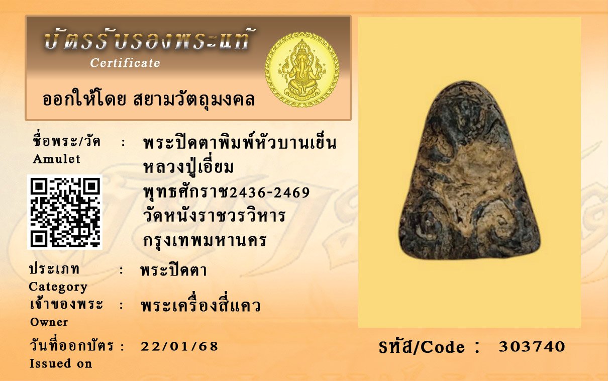 รหัสสินค้า : 303740 พระปิดตาพิมพ์หัวบานเย็น หลวงปู่เอี่ยม พุทธศักราช2436-2469 วัดหนังราชวรวิหาร กรุงเทพมหานคร