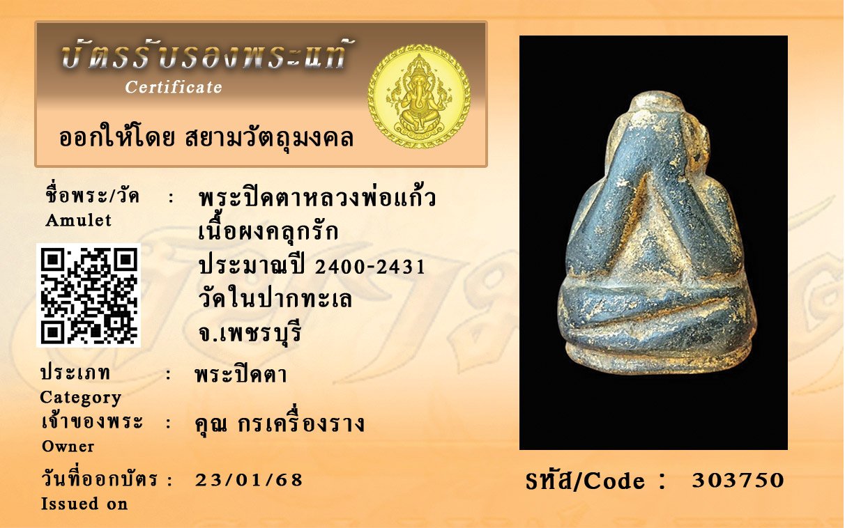 รหัสสินค้า : 303750 พระปิดตาหลวงพ่อแก้ว เนื้อผงคลุกรัก ประมาณปี 2400-2431 วัดในปากทะเล จ.เพชรบุรี