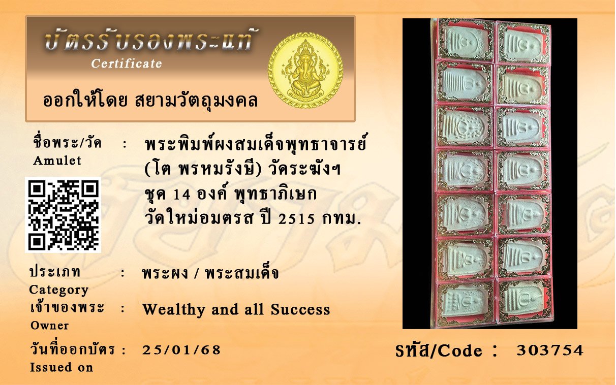 รหัสสินค้า : 303754 พระพิมพ์ผงสมเด็จพุทธาจารย์ (โต พรหมรังษี) วัดระฆังฯ ชุด 14 องค์ พุทธาภิเษก วัดใหม่อมตรส ปี 2531 กทม.