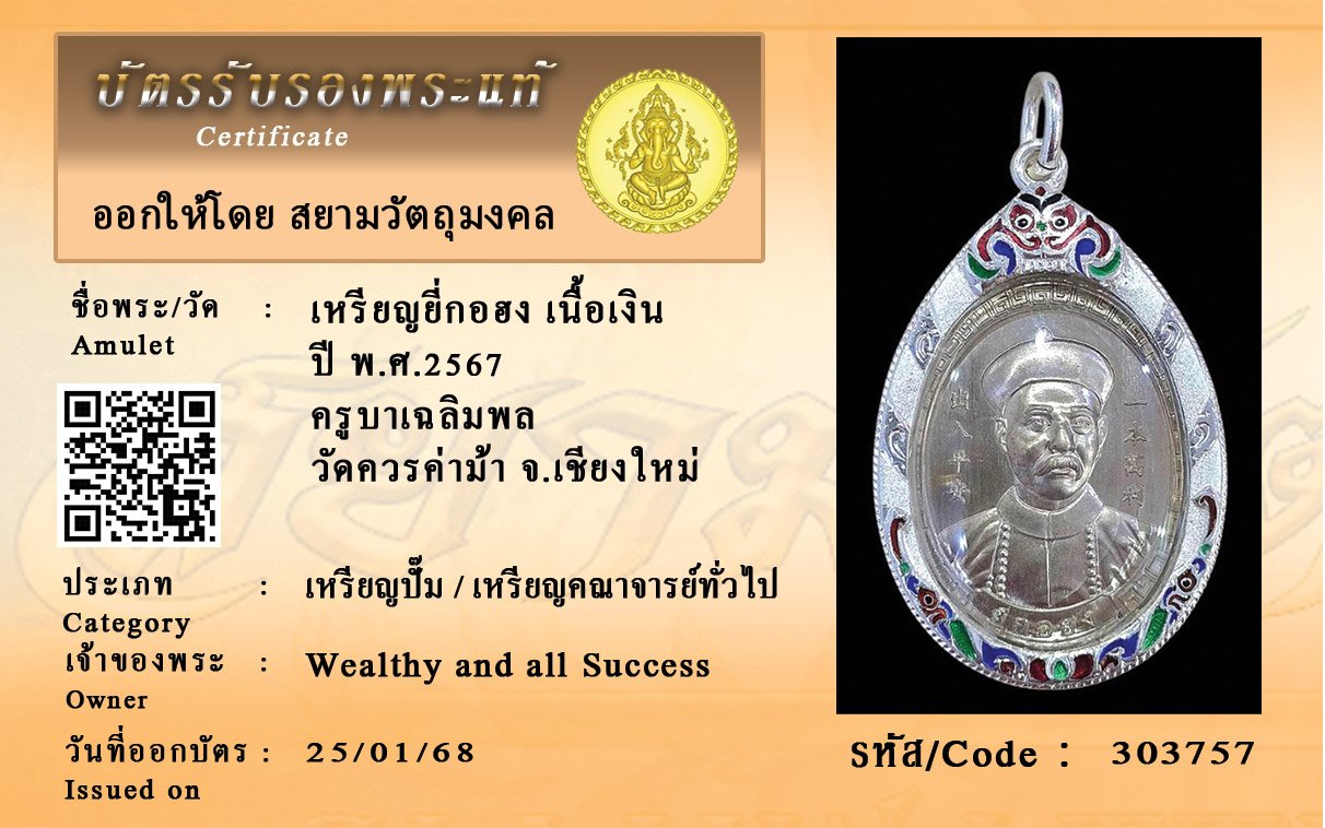 รหัสสินค้า : 303757 เหรียญยี่กอฮง เนื้อเงิน ปี พ.ศ.2567 ครูบาเฉลิมพล วัดควรค่าม้า จ.เชียงใหม่