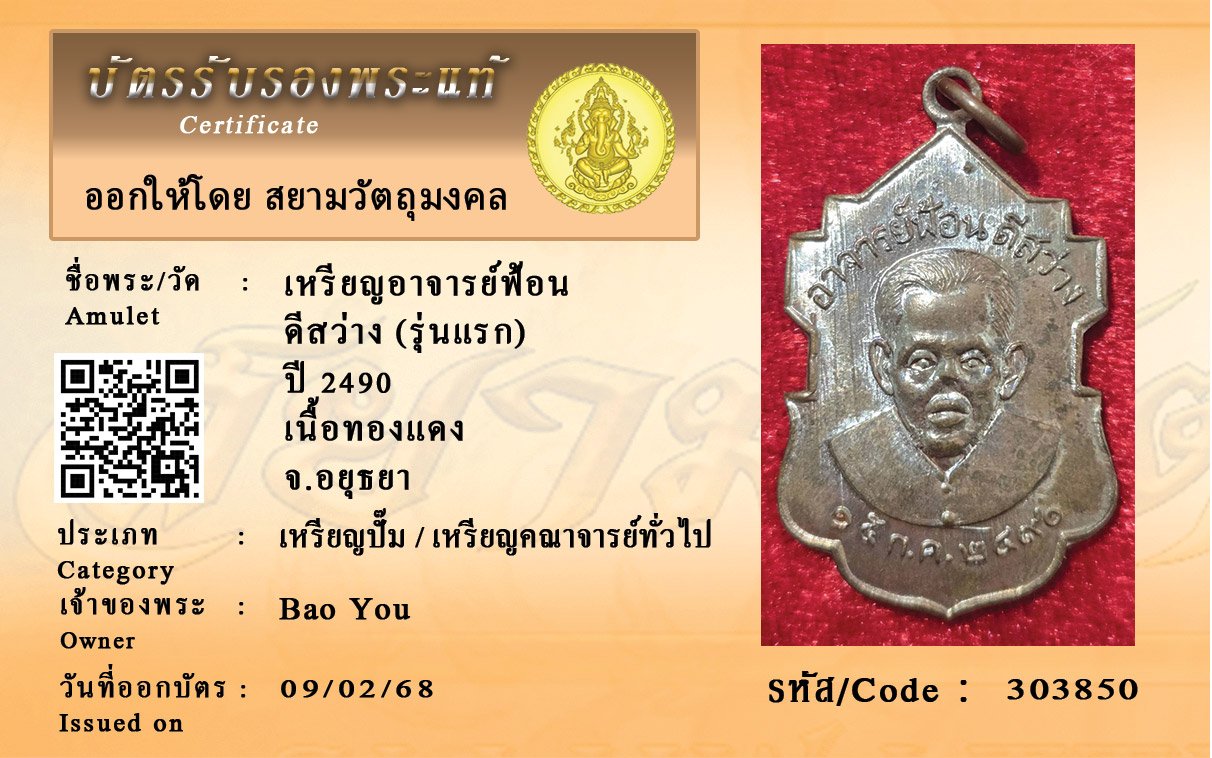 รหัสสินค้า : 303850 เหรียญอาจารย์ฟ้อน ดีสว่าง (รุ่นแรก) ปี 2490 เนื้อทองแดง จ.อยุธยา